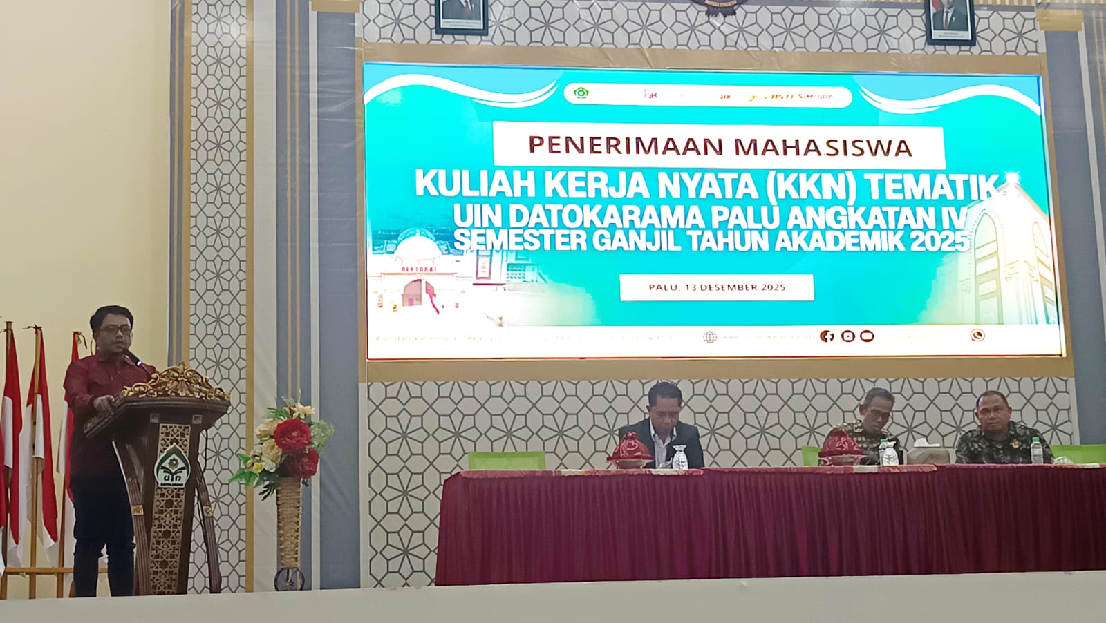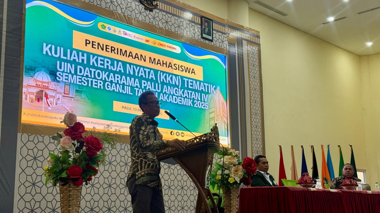 LP2MUINDATOKARAMA.ac.id | Palu, Rektor UIN Datokarama Palu Prof. Dr. H. Lukman S. Thahir menerima secara resmi mahasiswa kuliah kerja nyata (KKN) Tematik Angkatan IV Semestet Ganjil Tahun 2025 di Auditorium Kampus UIN Datokarama, Sabtu, 13/12/2025.