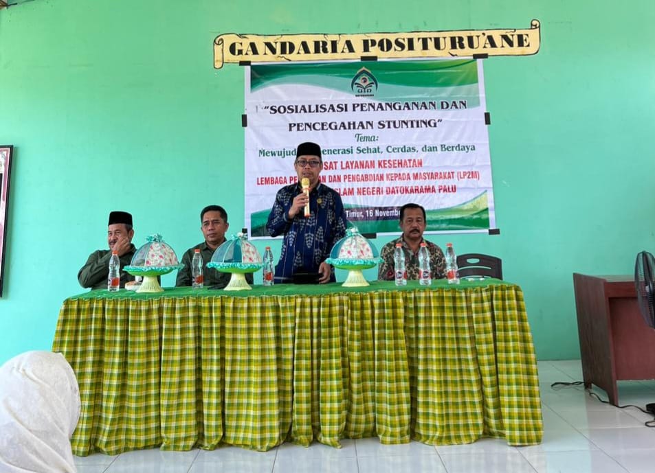 Palu, 18/11 (UIN Palu) – Universitas Islam Negeri (UIN) Datokarama mensosialisasikan pencegahan dan penanganan stunting (kekerdilan) di Desa Gio Timur, Kecamatan Moutong, Kabupaten Parigi Moutong, Provinsi Sulawesi Tengah, sebagai bentuk kontribusi nyata perguruan tinggi tersebut dalam mewujudkan kesehatan generasi muda yang berdampak pada peningkatan kualitas sumber daya masyarakat.